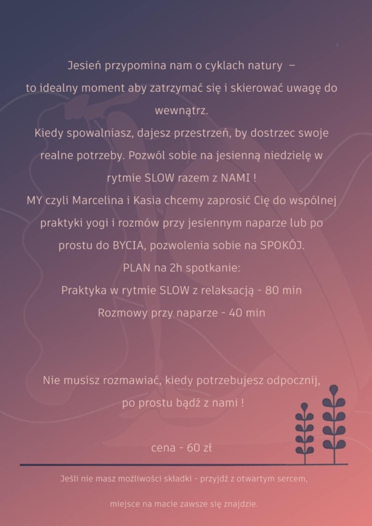 Kiedy spowalniasz, dajesz przestrzeń, by dostrzec swoje realne potrzeby. Pozwól sobie na jesienną niedzielę w rytmie SLOW razem z NAMI! MY czyli Marcelina i Kasia chcemy zaprosić Cię do wspólnej praktyki yogi i rozmów przy jesiennym naparze lub po prostu do BYCIA, pozwolenia sobie na SPOKÓJ.
